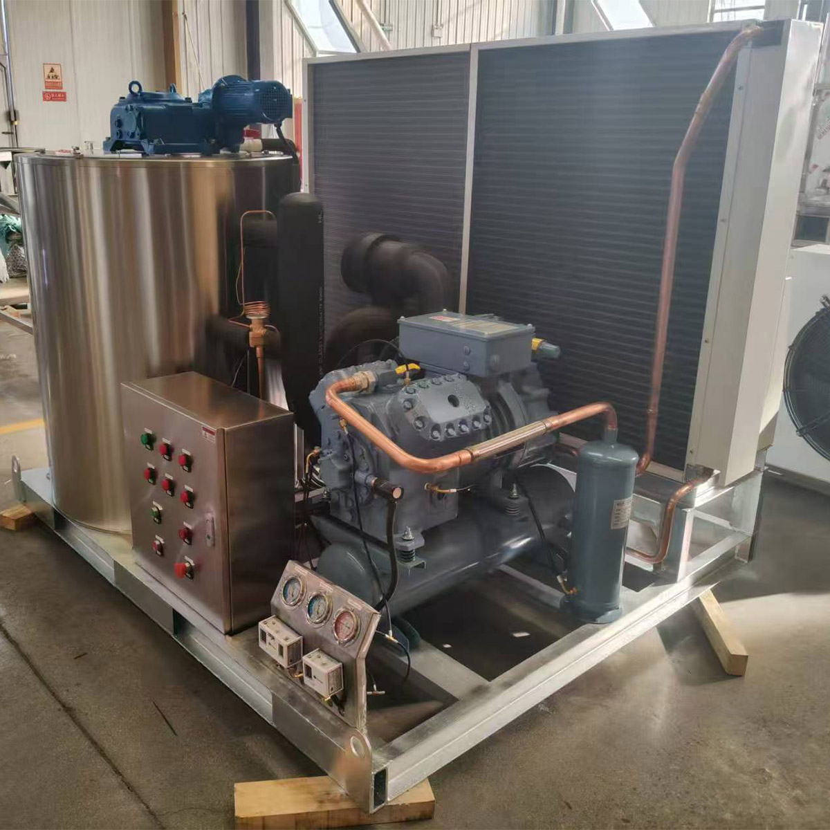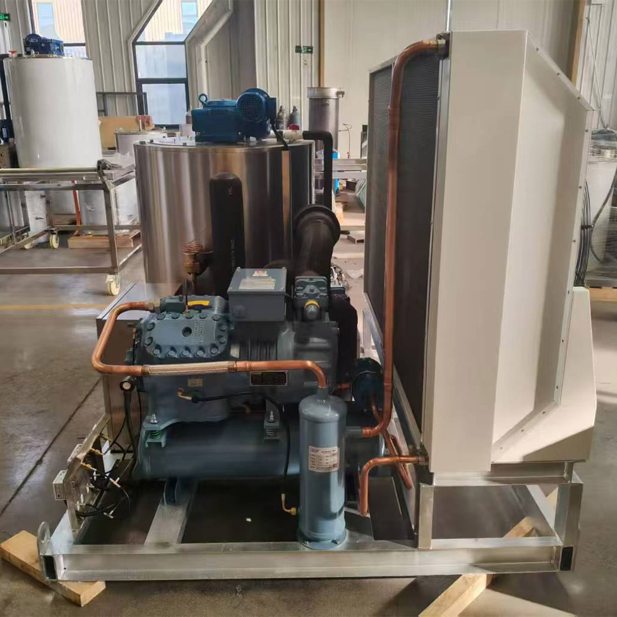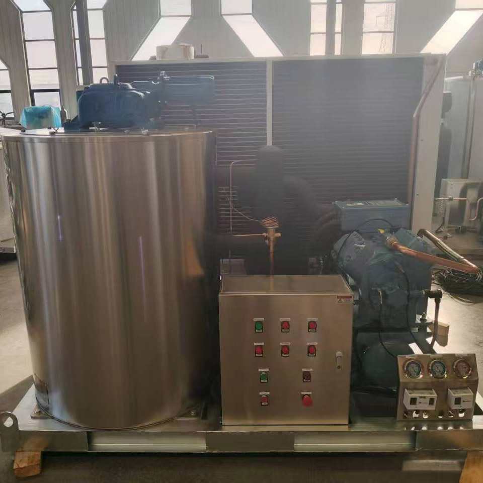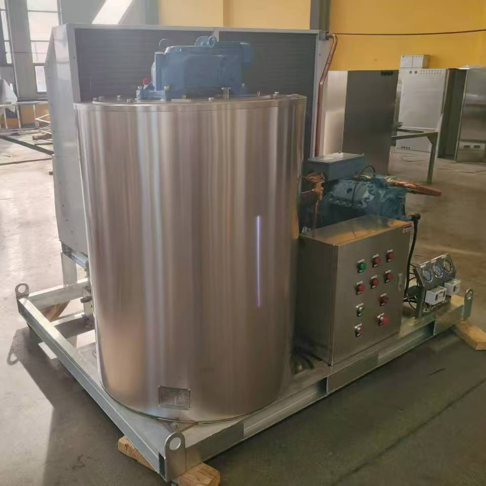 Basic Configuration: Features a modular and compact design, equipped with a stainless steel base and drum cover. The evaporator inner wall can be made of chrome-plated carbon steel or stainless steel. Core components use international standard parts, often equipped with high-efficiency scroll or semi-hermetic reciprocating compressors from well-known brands such as Danfoss and Copeland, as well as air-cooled condensers and heavy-duty reducers. It is compatible with various refrigerants such as R22 and R404A.