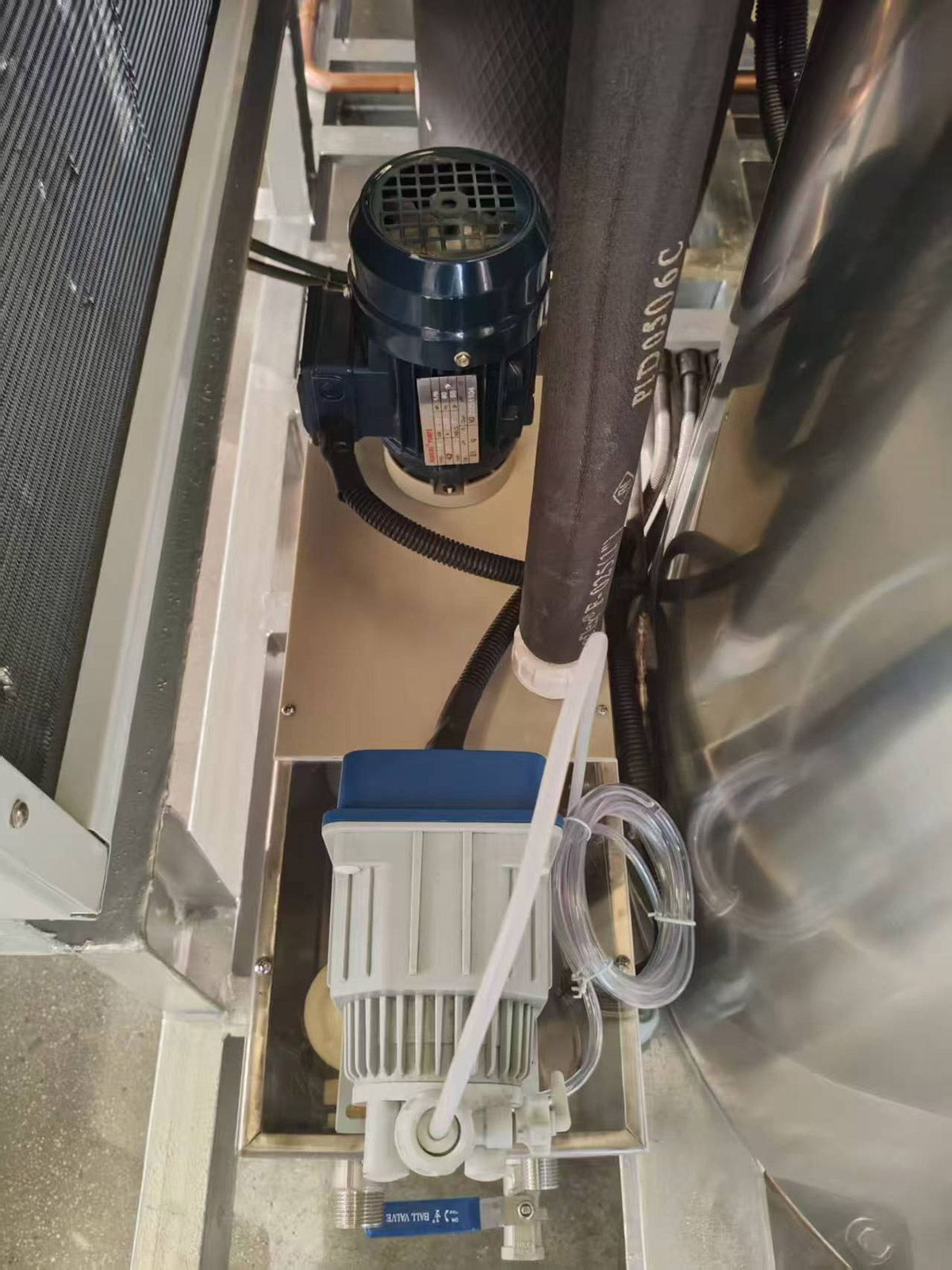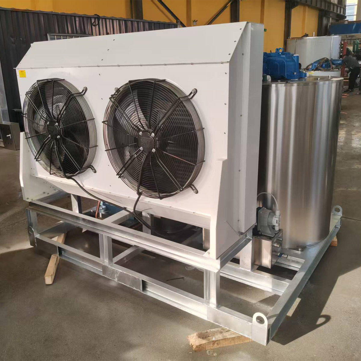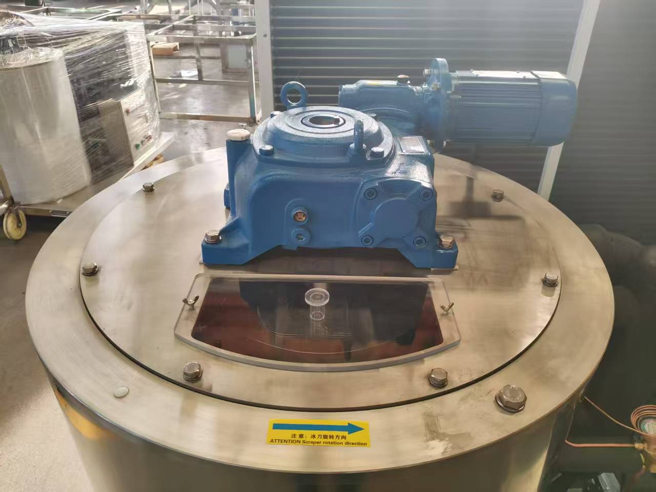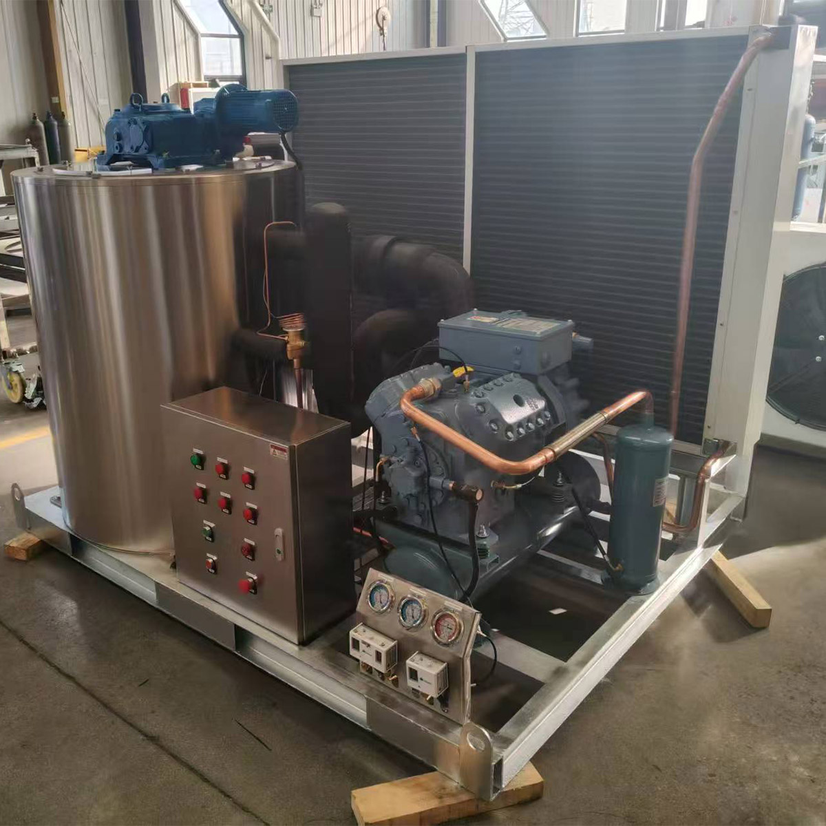 Basic Configuration: Features a modular and compact design, equipped with a stainless steel base and drum cover. The evaporator inner wall can be made of chrome-plated carbon steel or stainless steel. Core components use international standard parts, often equipped with high-efficiency scroll or semi-hermetic reciprocating compressors from well-known brands such as Danfoss and Copeland, as well as air-cooled condensers and heavy-duty reducers. It is compatible with various refrigerants such as R22 and R404A.